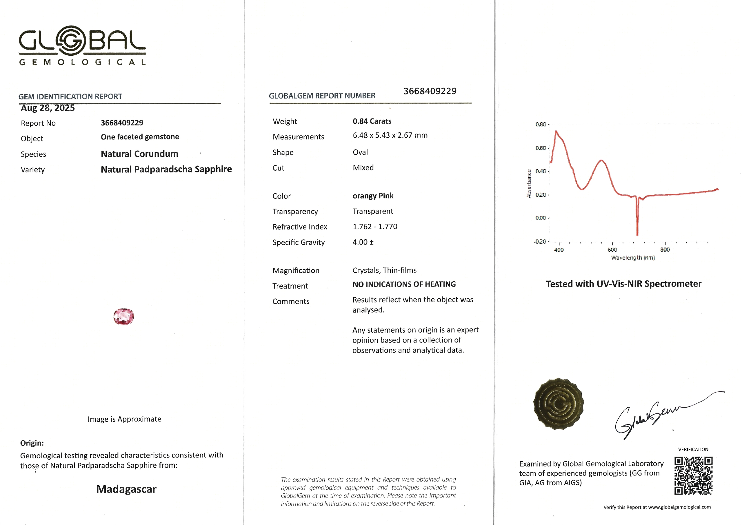 | Gemstone | Unheated Natural Padparadscha Sapphire, 0.84ct (6.48×5.43×2.67mm) |